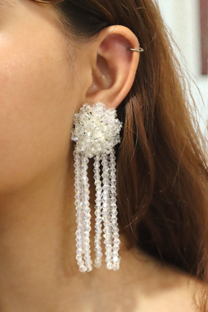Featuring a stunning arrangement of clear crystal beads, these earrings exude a timeless charm. The intricate beadwork forms a beautiful floral cluster at the top, cascading down into delicate strands that move gracefully with you. Whether you're dressing up for a formal event or adding a touch of glamour to your everyday look, the Crystal Cascade Earrings are the perfect choice.