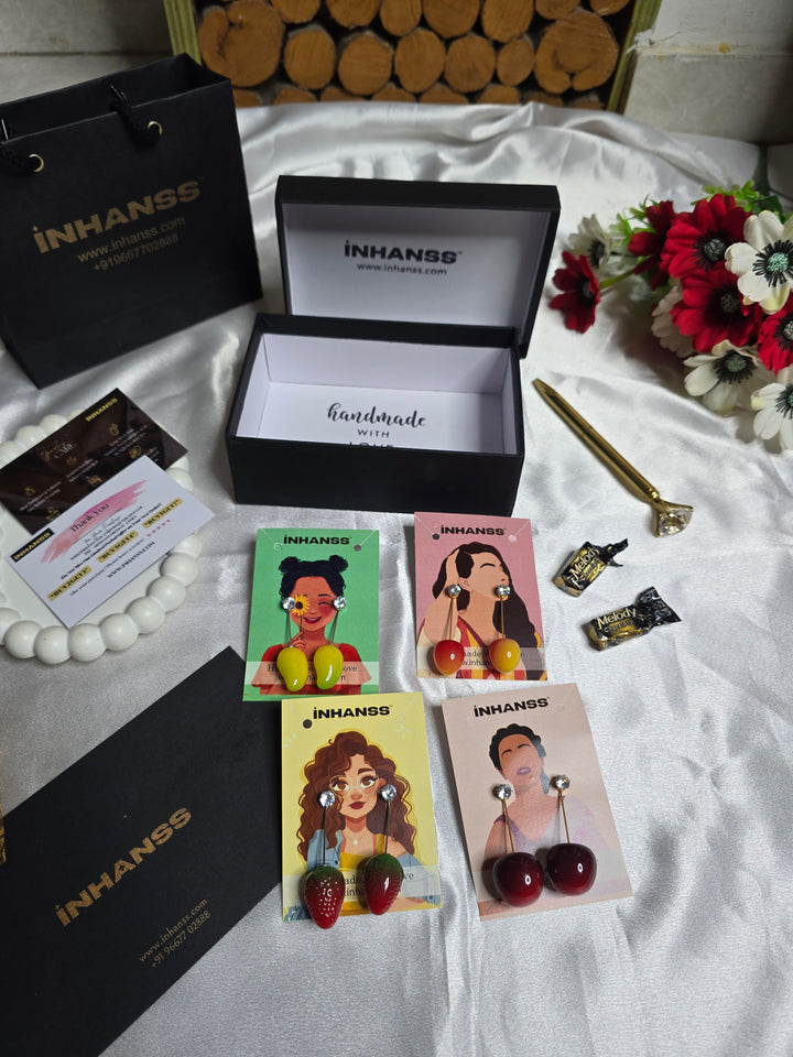 Gift a little sweetness today! Shop our INHANSS Fruit-Inspired Earrings Gift Hamper now and delight her with playful elegance from desk to dinner.
