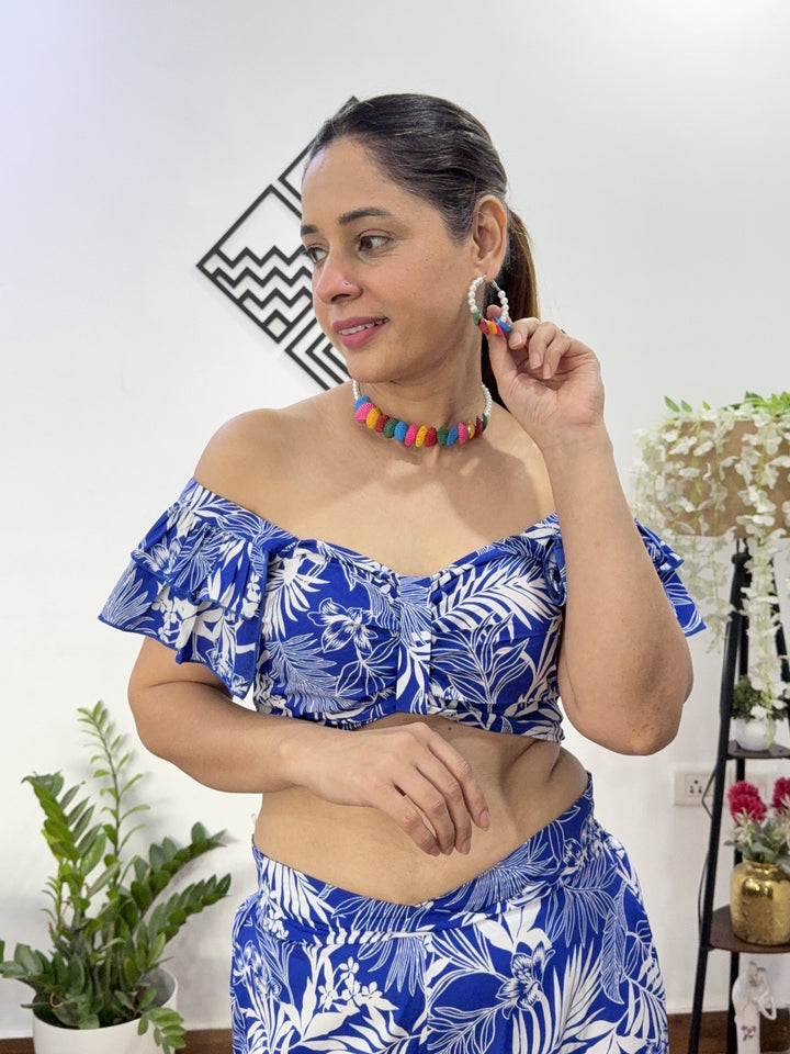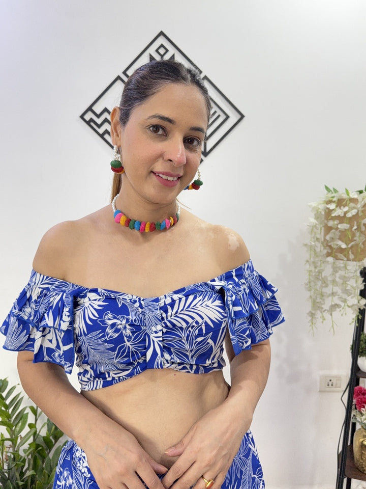Crafted with precision, the necklace features alternating bright-coloured shells and lustrous pearls, creating a captivating contrast that's sure to turn heads. The matching hoop earrings perfectly complement the necklace, making this set an ideal choice for both western and Indian wear.