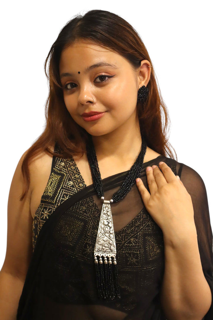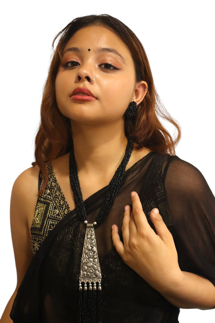 Elevate your style with the captivating allure of our Handmade Twilight Oxidized Black Metal Multi-Layered Long Necklace. This striking piece features multiple strands of beads, beautifully complemented by an intricately designed oxidized pendant, making it the ultimate statement accessory for any occasion.