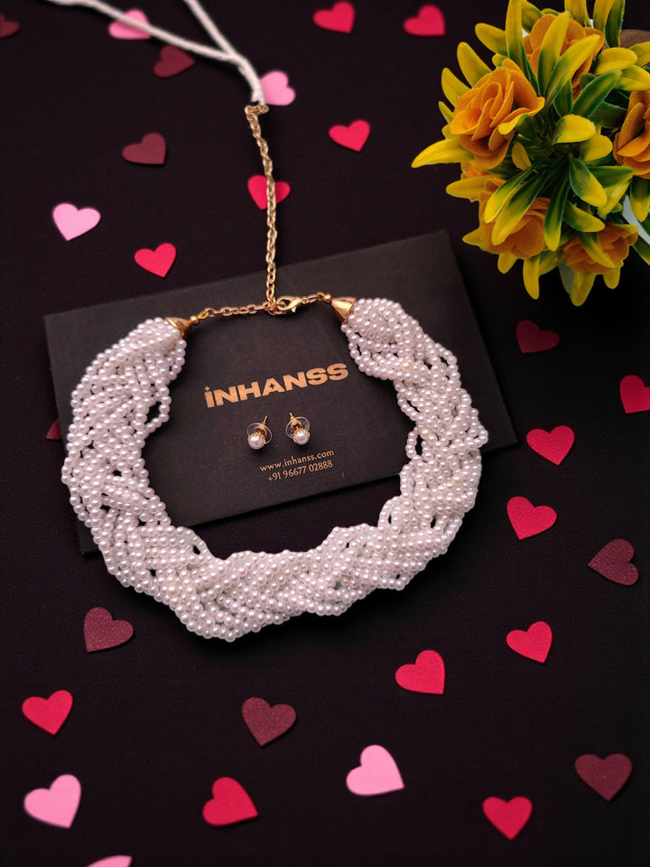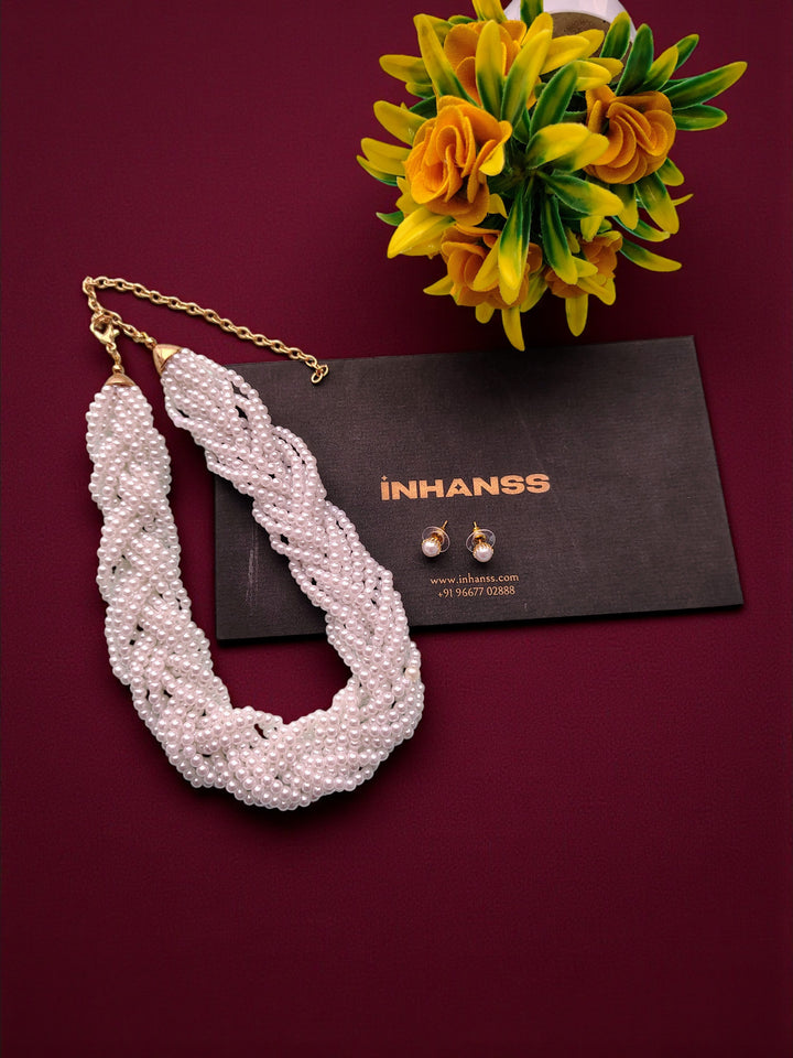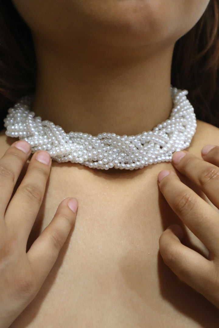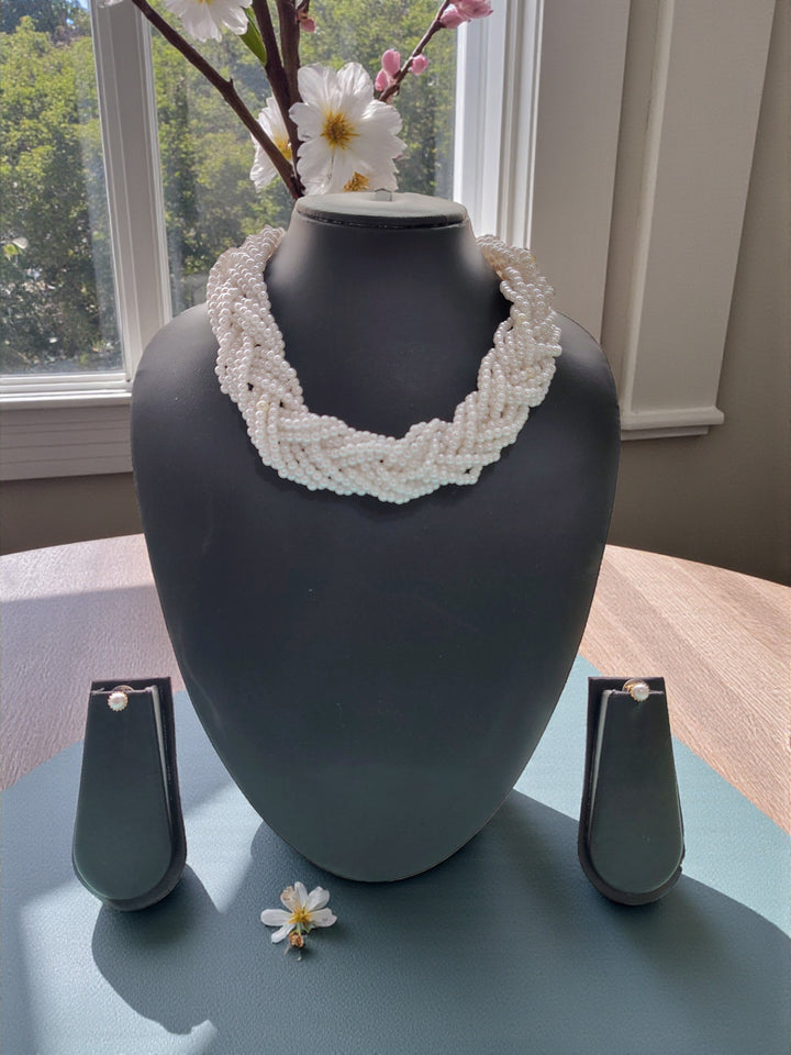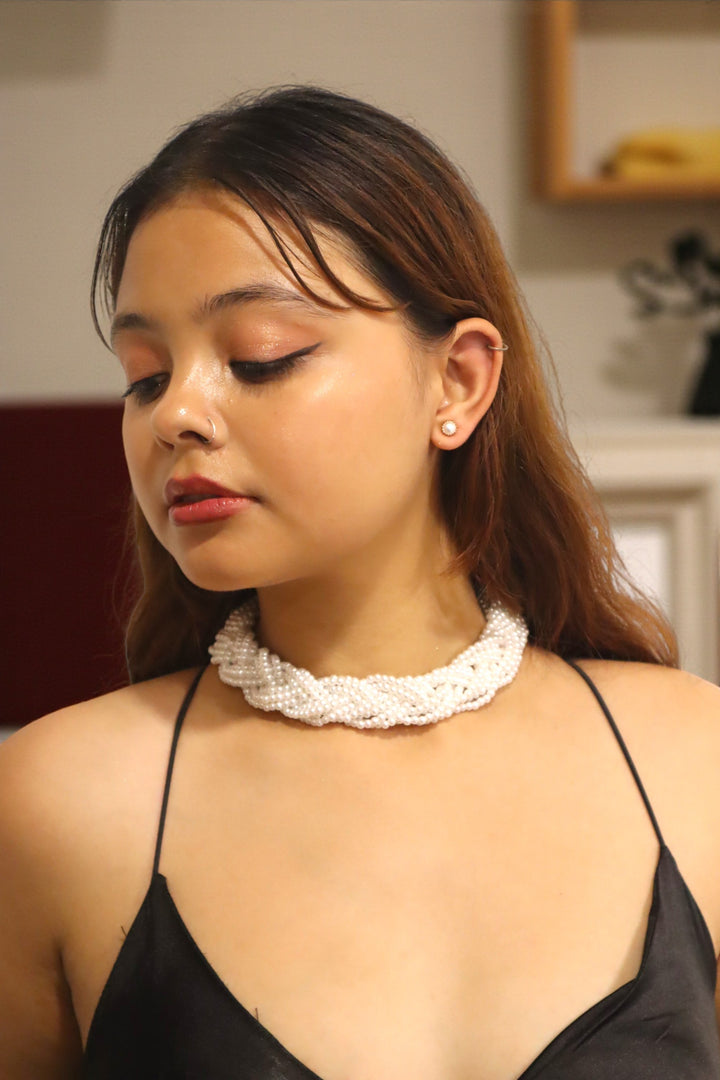 This stunning choker is made with premium handwoven pearls, forming a rich braided texture that’s both classic and modern. It comes with matching pearl studs, giving you two looks in one set — wear them together for an elegant statement, or style them separately for a minimal, chic vibe.