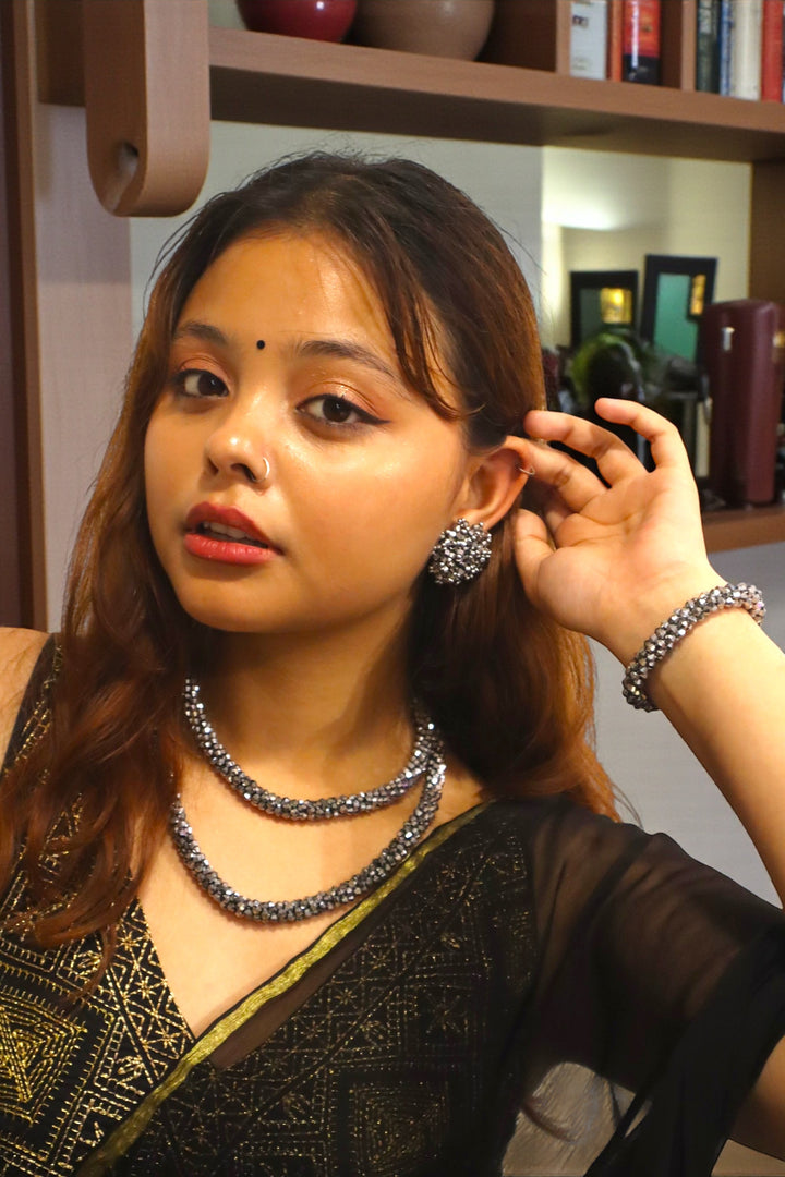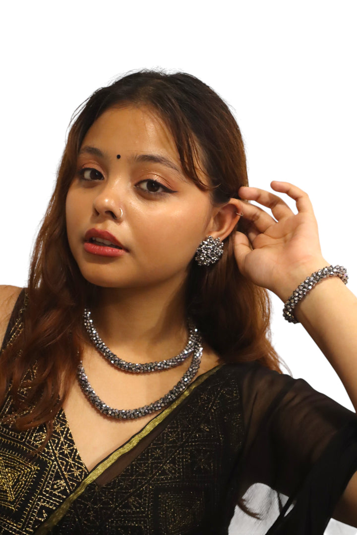 Step into the spotlight with a statement that radiates elegance and charm – the Midnight Shimmer Handmade Metal Piece Set. Crafted with a stunning array of meticulously designed metal beads, this set adds the perfect touch of glamour to your festive and casual occasions.