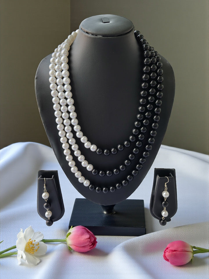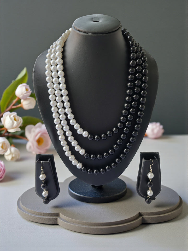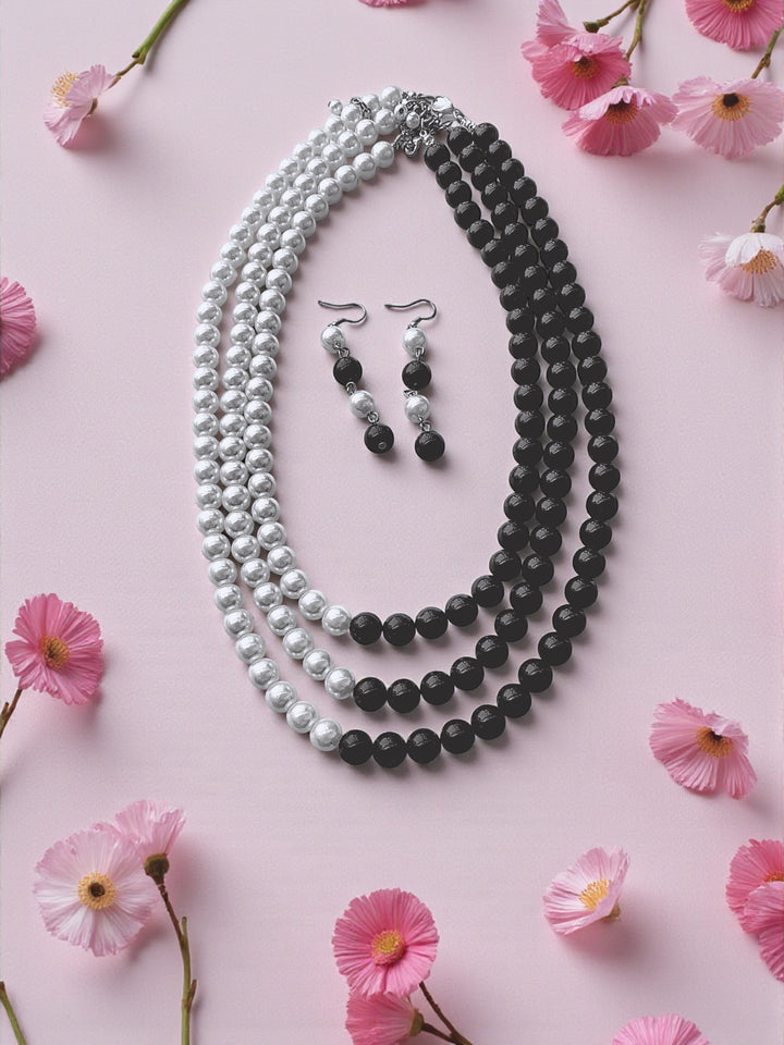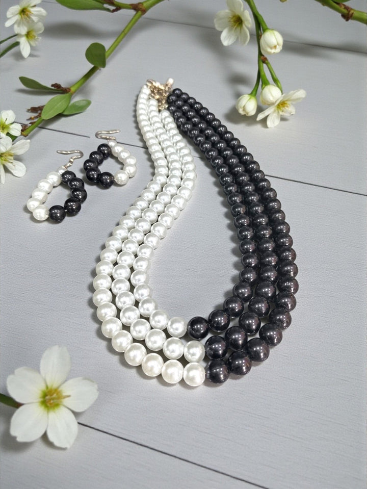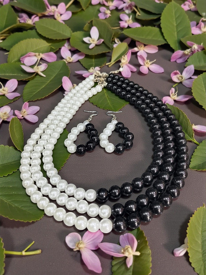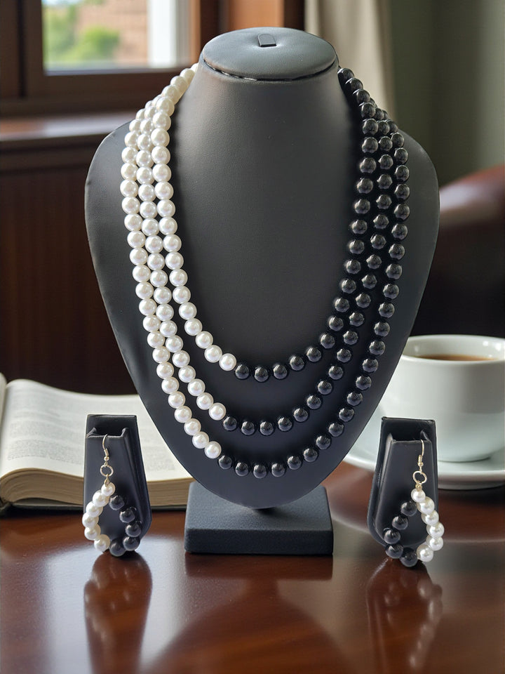 Whether you prefer just one clean strand for office, a double layer for brunch, or the full dramatic stack for evenings — this set keeps up with every mood. And the best part? You get two matching earrings, so you can style them with the white necklace, black necklace, or the full mixed look.