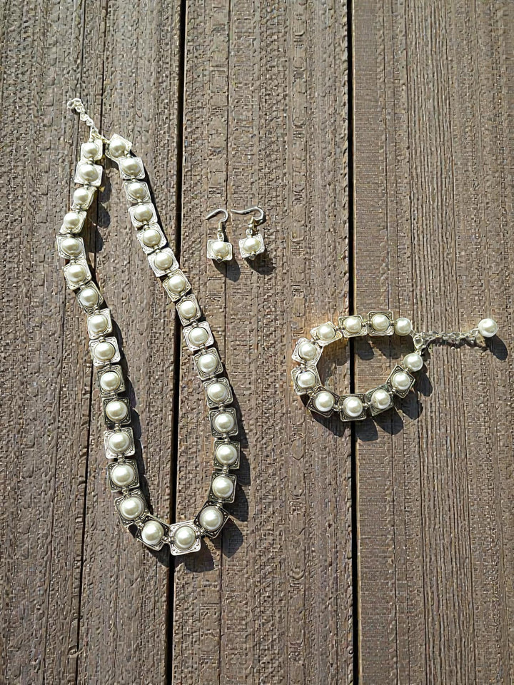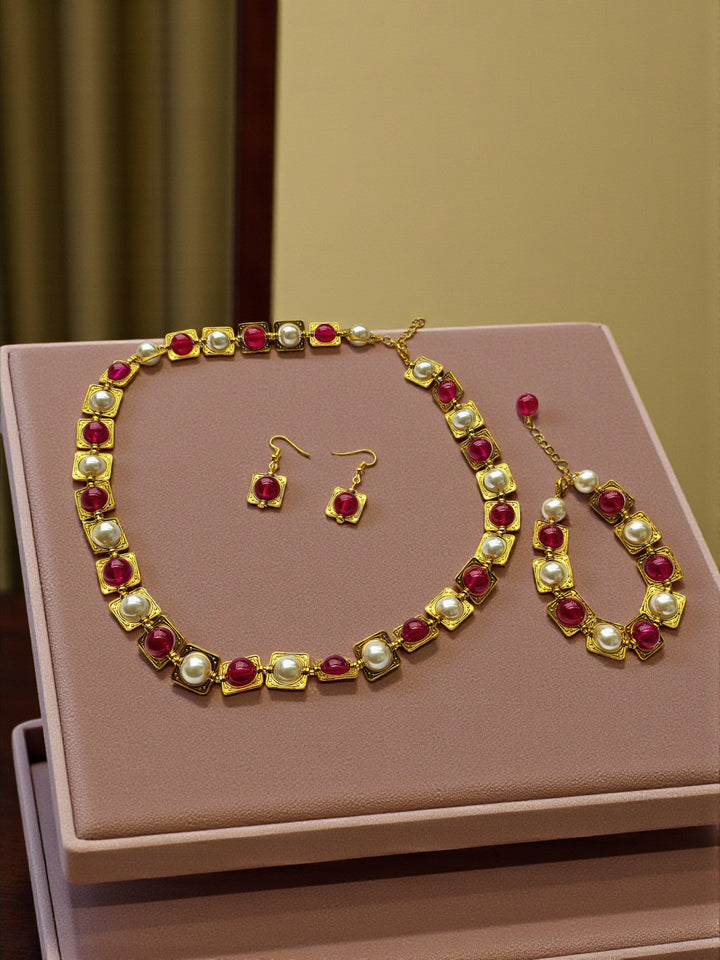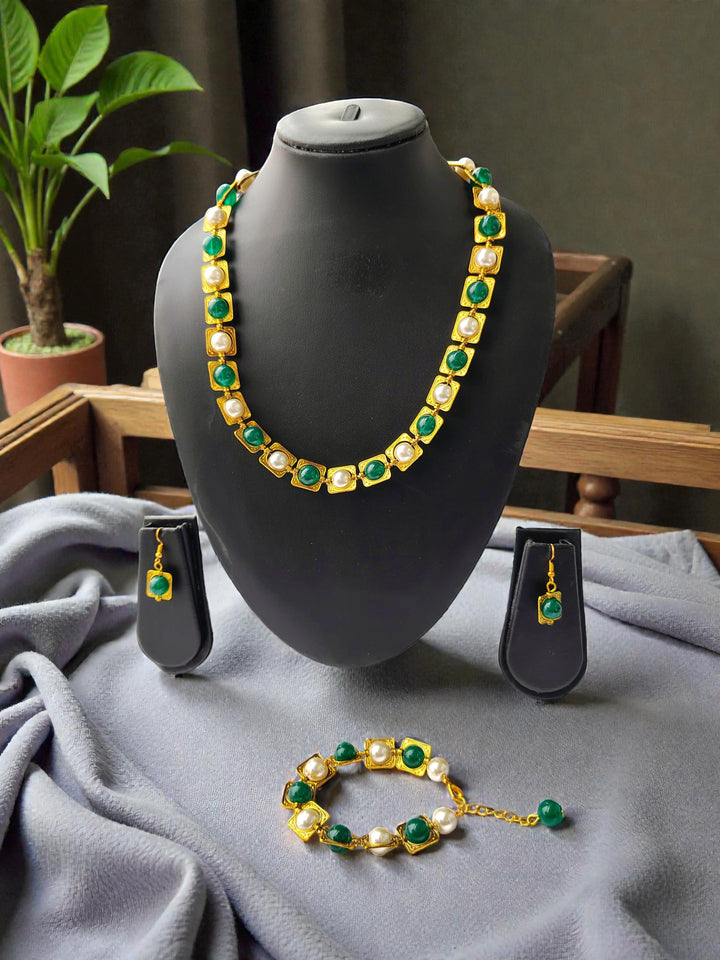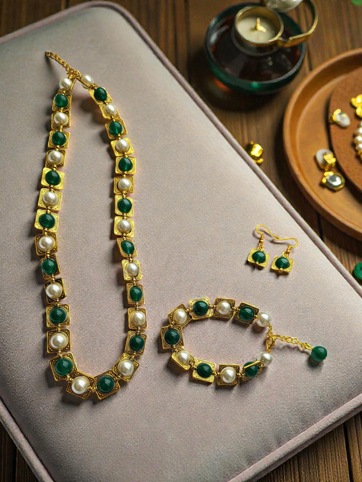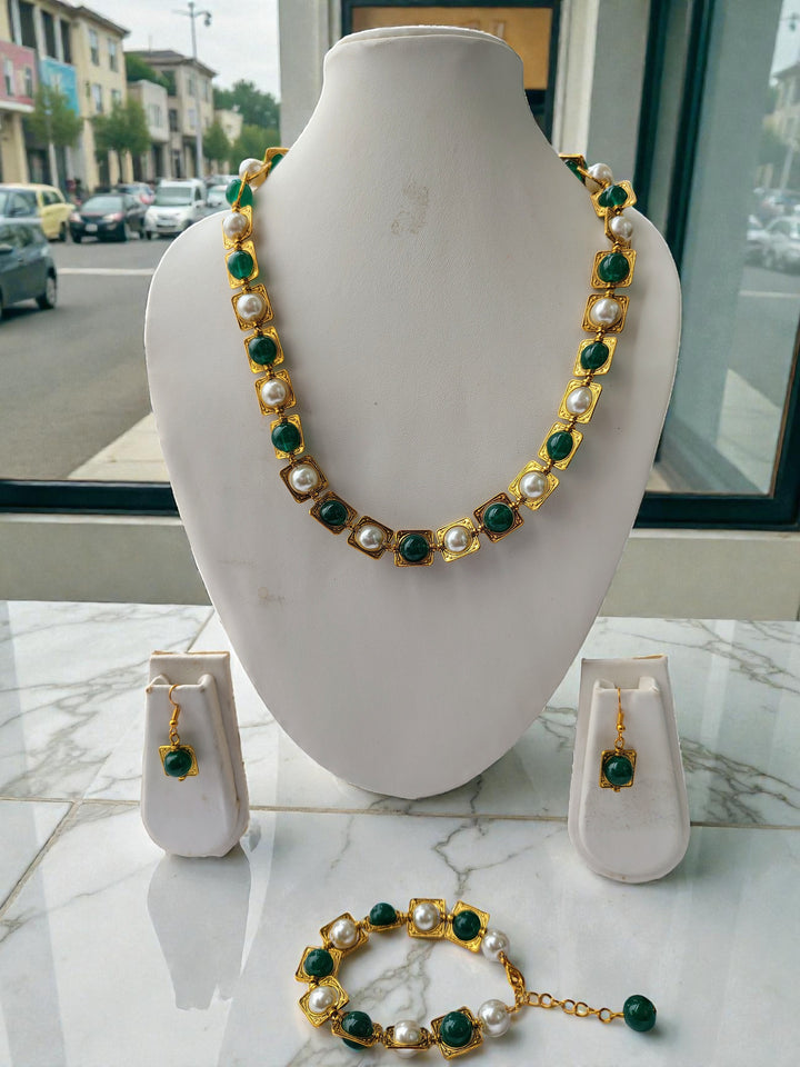 Step into your royal moment with the Afsana Royale 3-Piece Set, a breathtaking fusion of elegance, tradition, and modern charm. Designed for women who love jewellery that tells a story, this set highlights dual-tone emerald beads and classic pearls framed in beautifully detailed gold-tone squares.